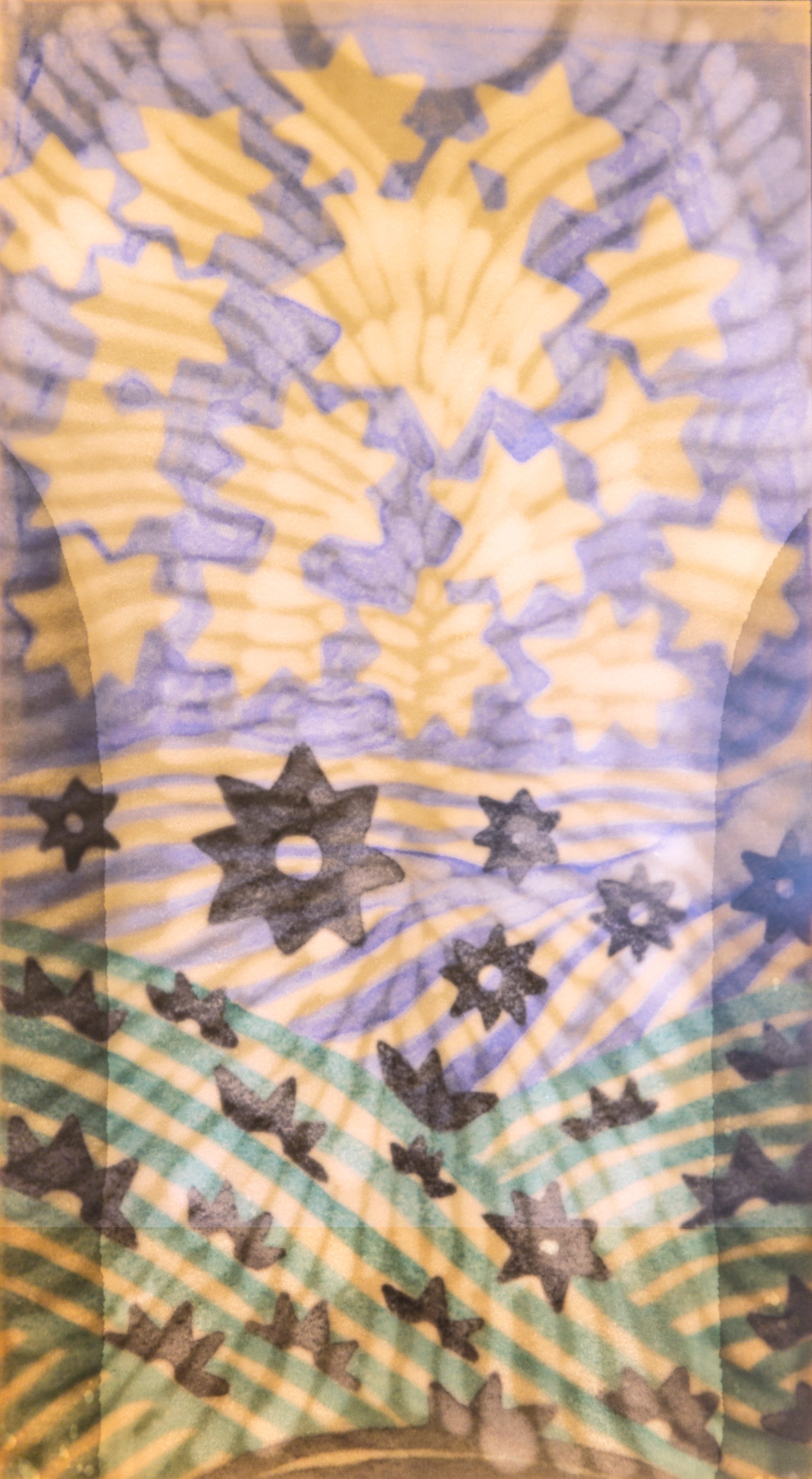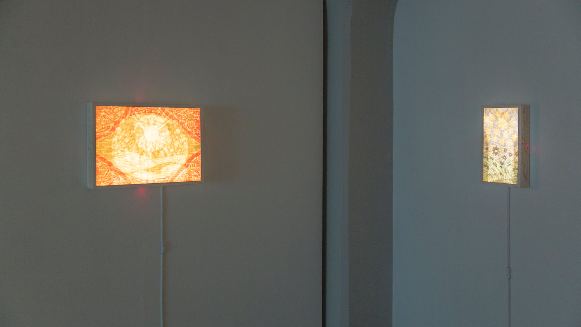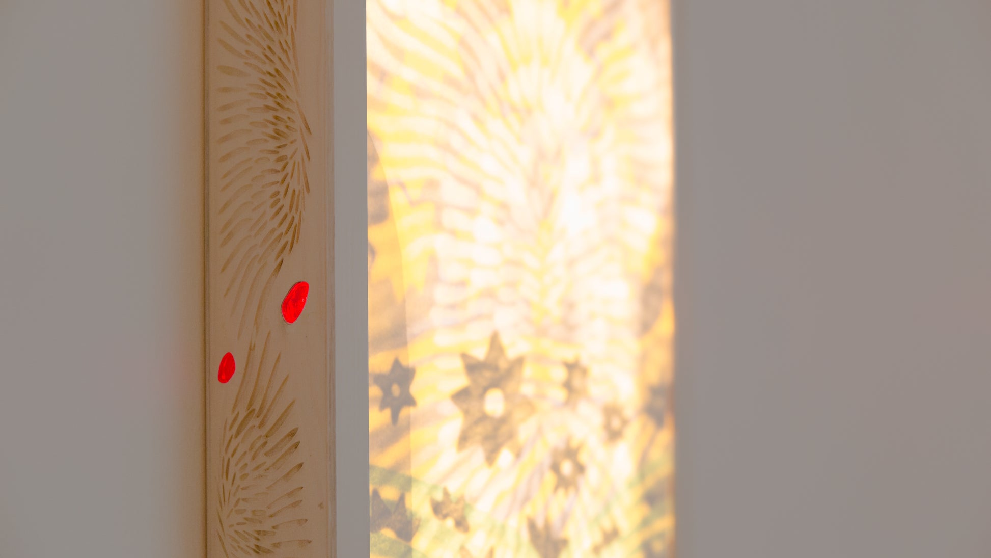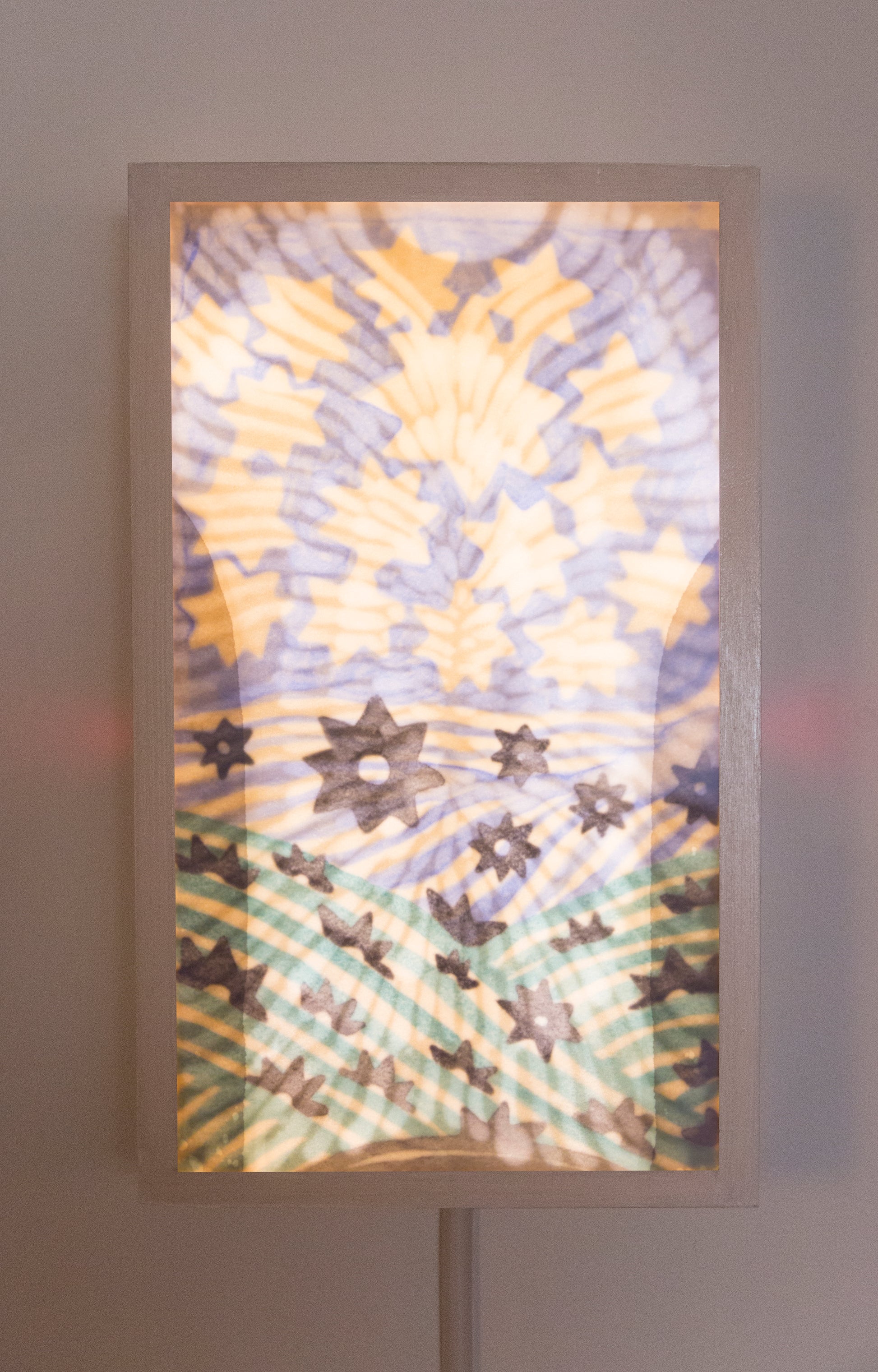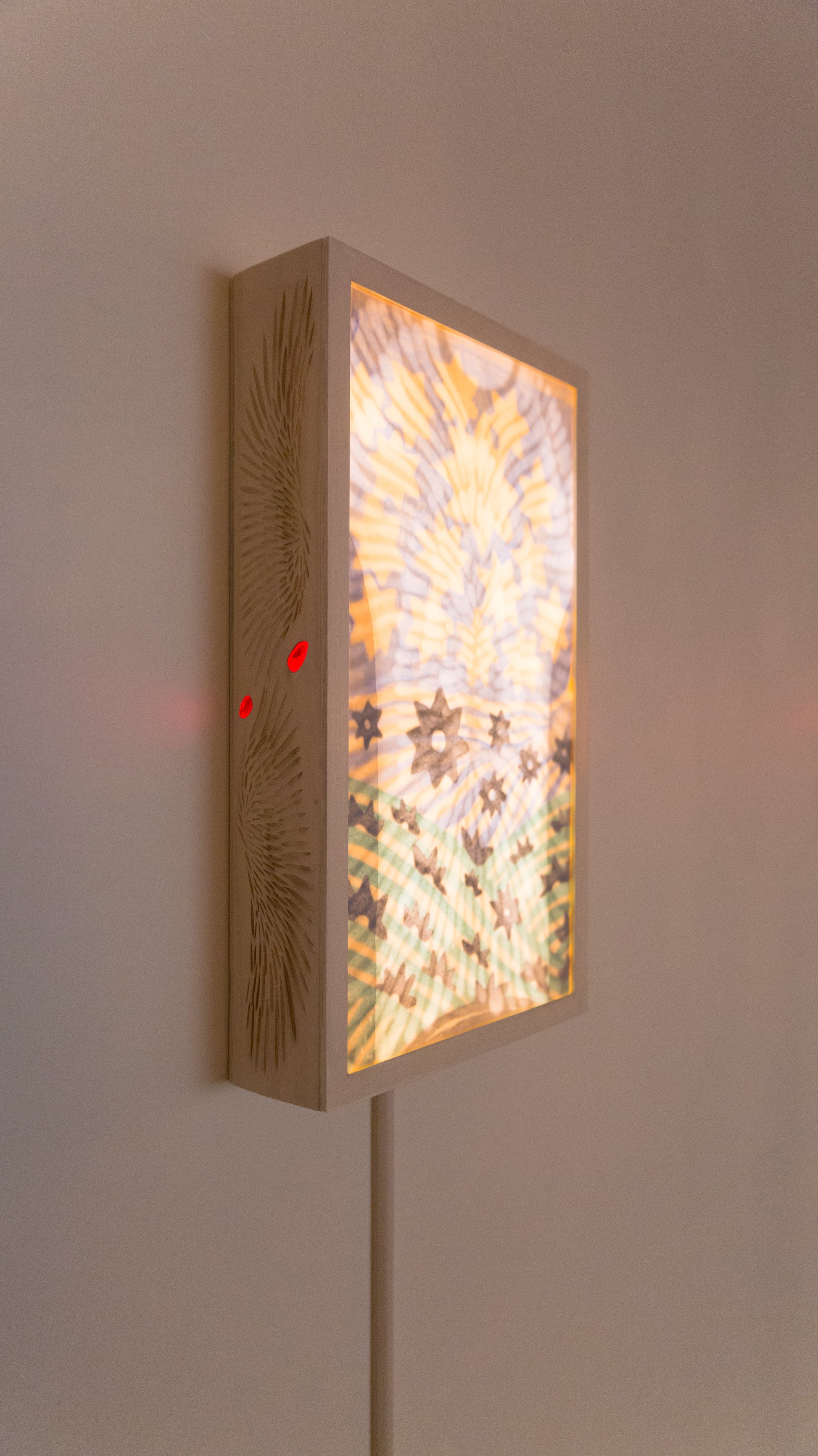 The light paintings are created using my own technique where light passes through a colorless painting medium. The technique allows for the layering of multiple drawings, causing the images to merge and intertwine as light filters through them. In the new light works, I wanted to add color and include more recognizable symbols, patterns and references, compared to my earlier monochromatic light paintings. The light boxes are made of wood, with carvings and inlays that allow light to pass through.