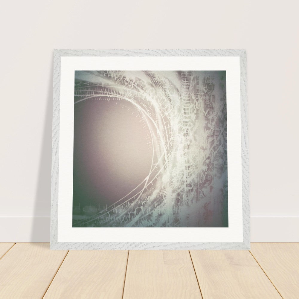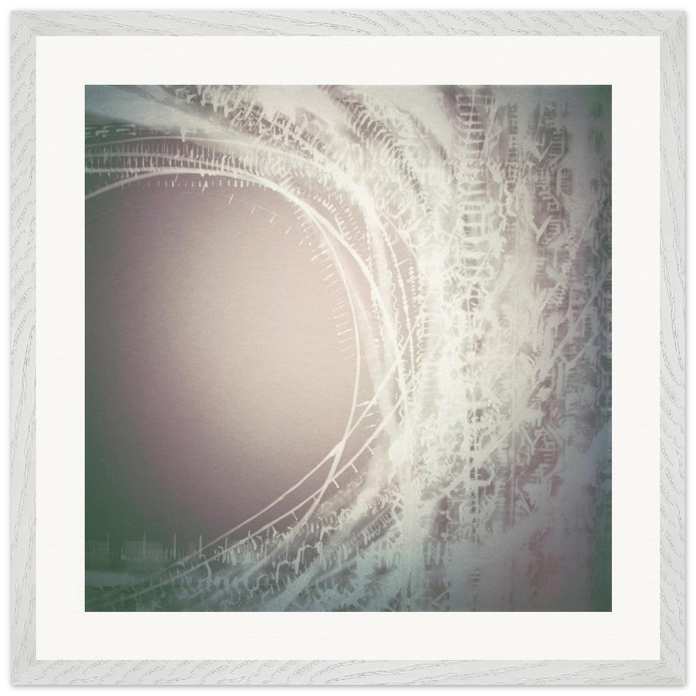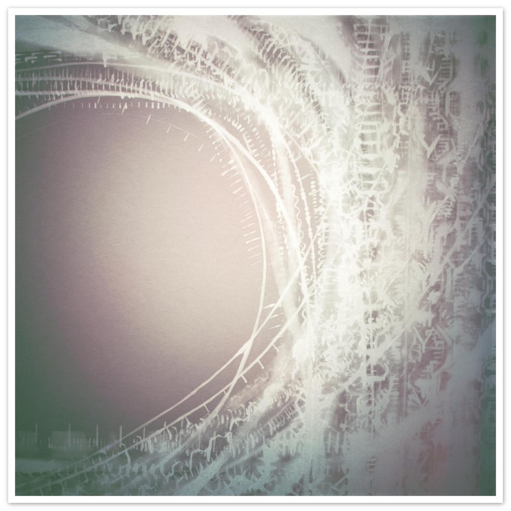 Fine white lines, arcs, and textures are drawn, resembling elements such as ancient scripts, leaf structures, maps, or other organic patterns. The arrangement of lines and textures directs the gaze in circular and spiral movements. The light shines through the work and brings it to life.