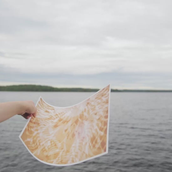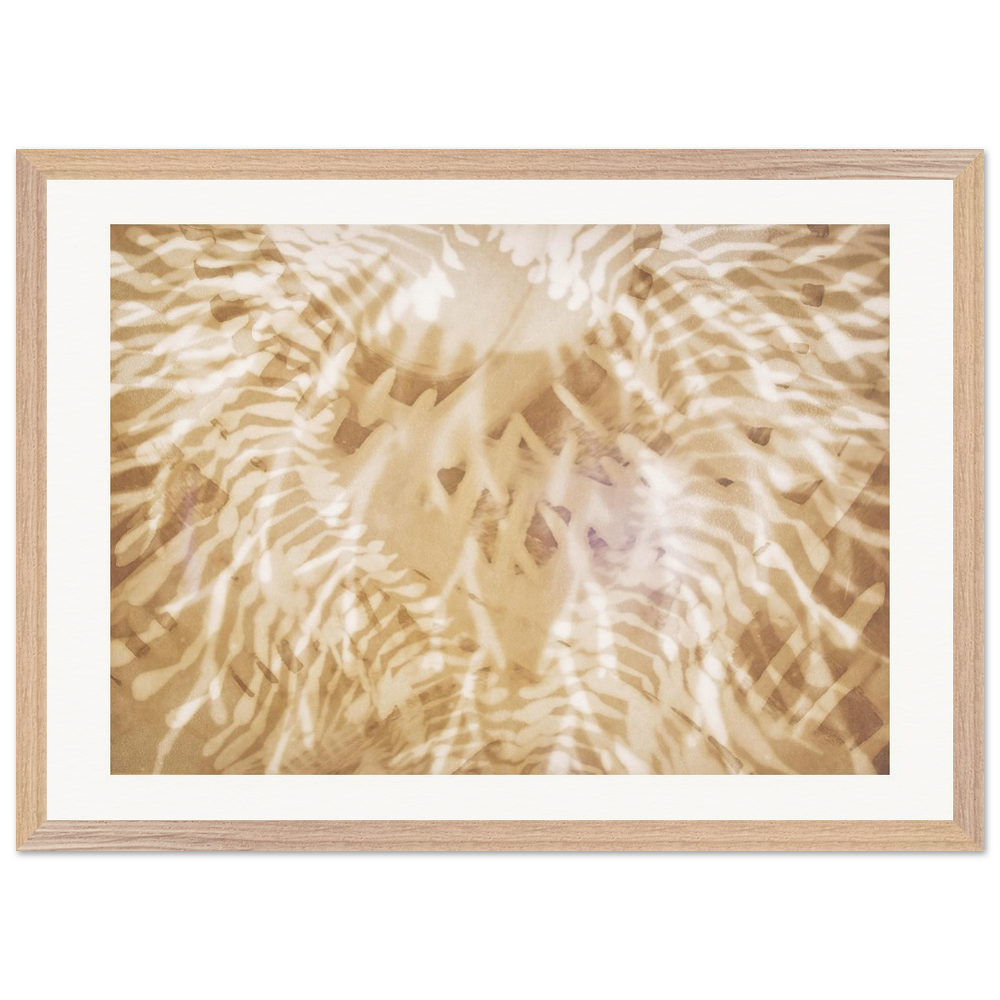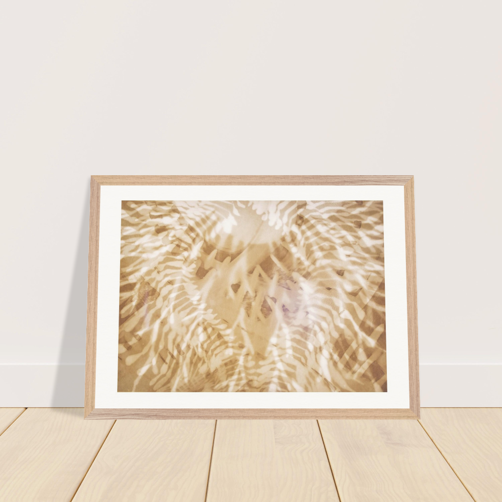 The work shows organic patterns spread across warm golden tones. The shapes resemble soft branches, waves, or other organic textures, creating a feeling of gentle movement. Because the artwork is made from three translucent papers stacked together, it has a sense of depth and layering. Light passes through the paper, highlighting different areas and making the surface look alive and shifting.