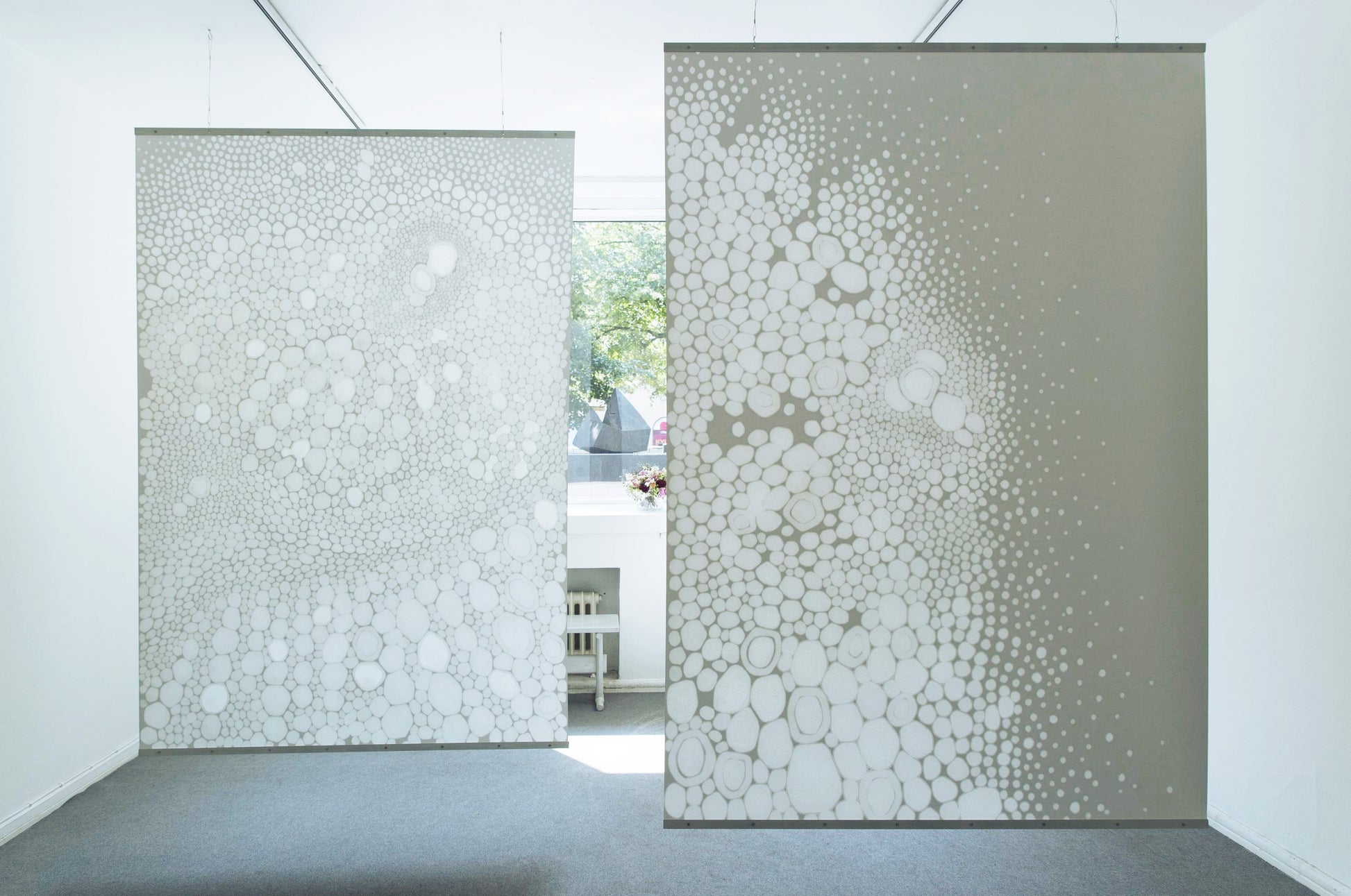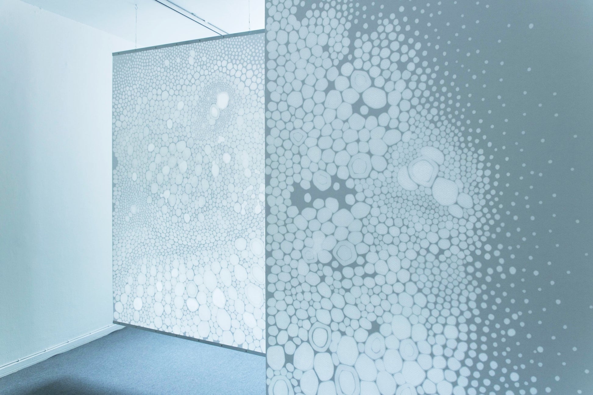 This piece is one half of Geminal (diptych), a 200 x 150 cm light drawing on paper, first shown in the solo exhibition Geminal at Gallery Oksasenkatu 11 in Helsinki. The hand-drawn pattern was inspired by plant cells — tiny structures that multiply by division and have the remarkable ability to harness energy from the sun. The work reflects this endless process of growth. During the exhibition, the artwork was lit naturally by sunlight during the day and by electric light at night.