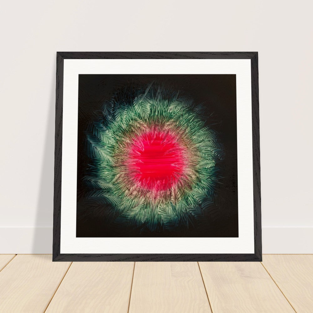 The original is 65x65cm oil painting from 2016. The painting depicts a moment of stepping out of the jungle of the mind into a new expansive landscape. The red core suggests a powerful emotional center, while the surrounding green foliage hints at the complexity left behind. It´s a portrait of the heart.