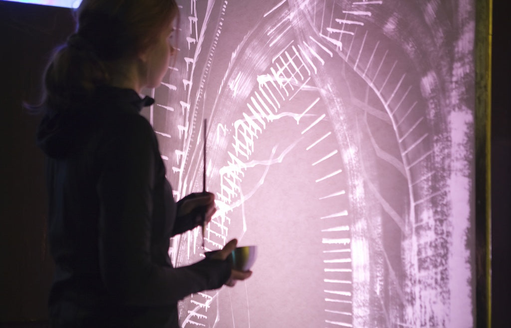 In the performance the paper served not just as a surface, but as a boundary between the light source and myself as the performer. The act of painting became a way of altering that boundary — each brushstroke making the paper more translucent, allowing more light to pass through. The result is a composition that brings together structural and organic forms, with lines and gestures suggesting a cathedral like space.