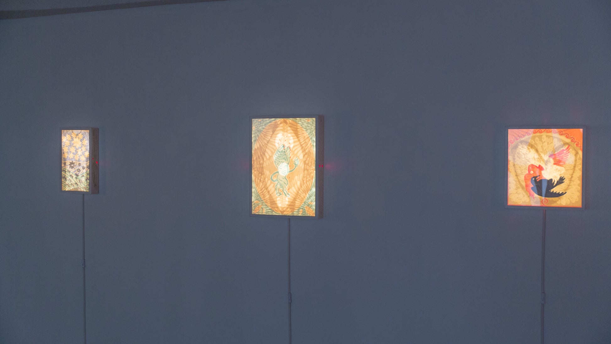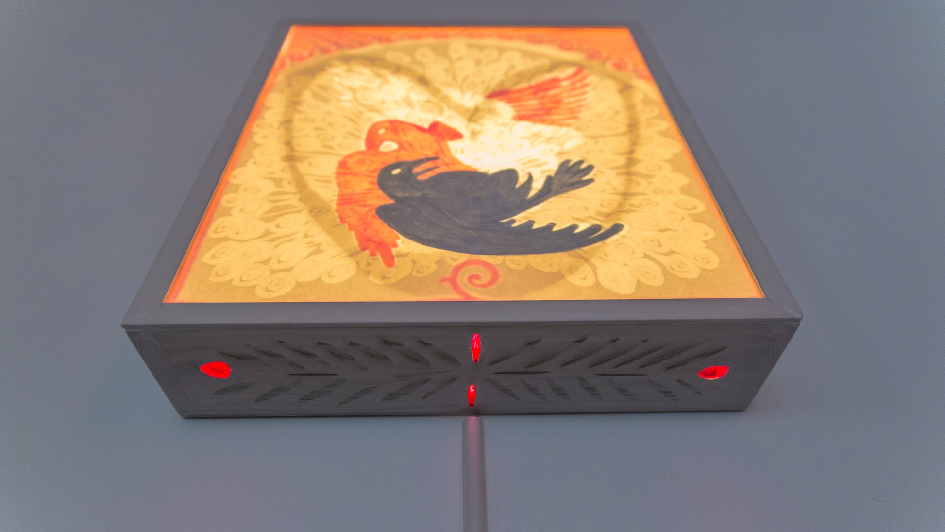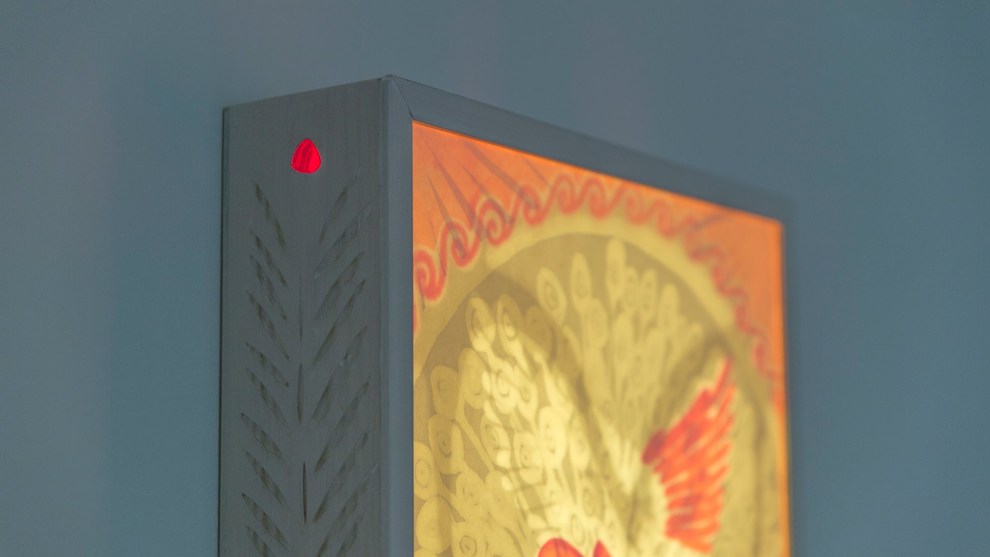 The light paintings are created using my own technique where light passes through a colorless painting medium. The technique allows for the layering of multiple drawings, causing the images to merge and intertwine as light filters through them. In the new light works, I wanted to add color and include more recognizable symbols, patterns and references, compared to my earlier monochromatic light paintings. The light boxes are made of wood, with carvings and inlays that allow light to pass through.