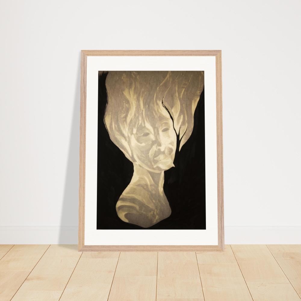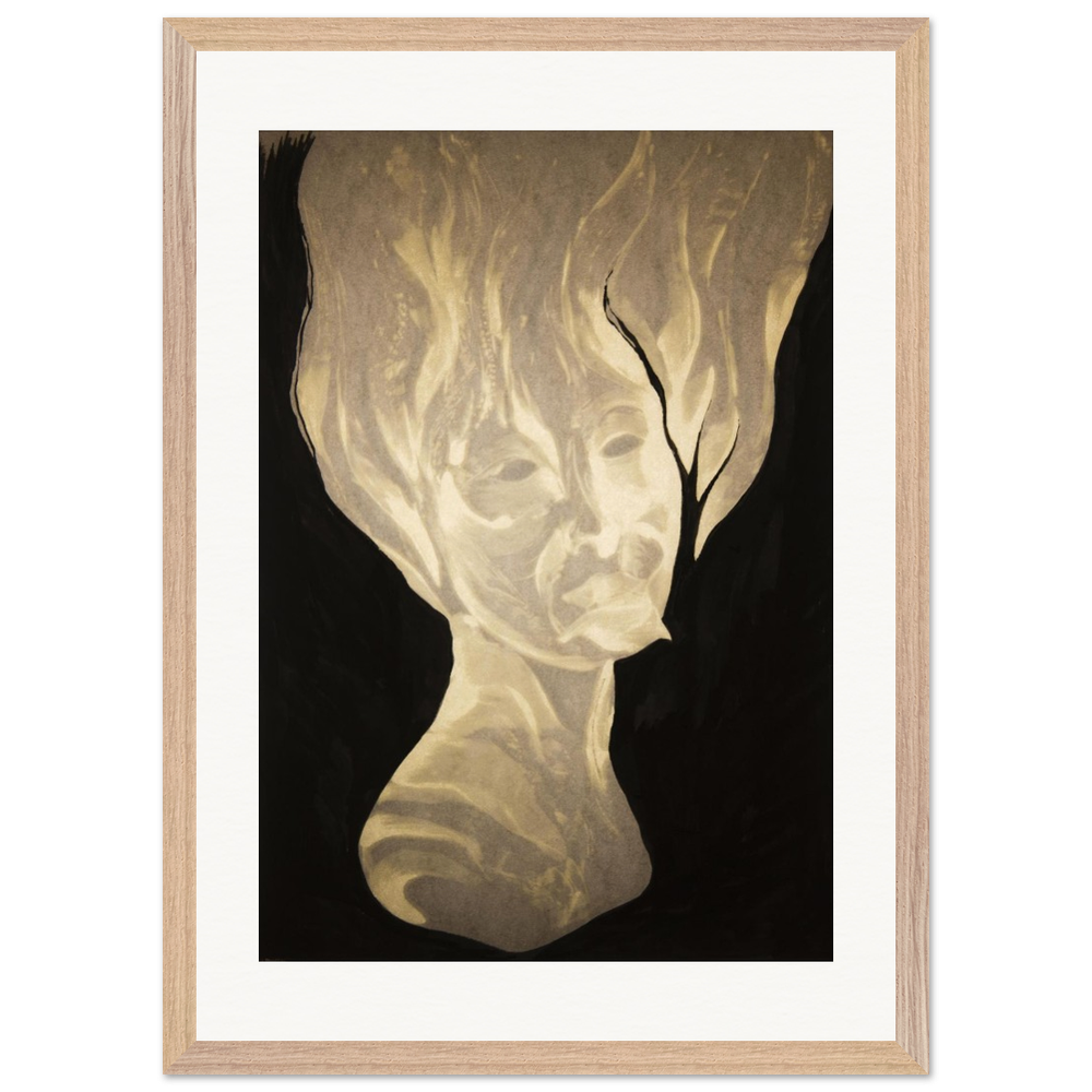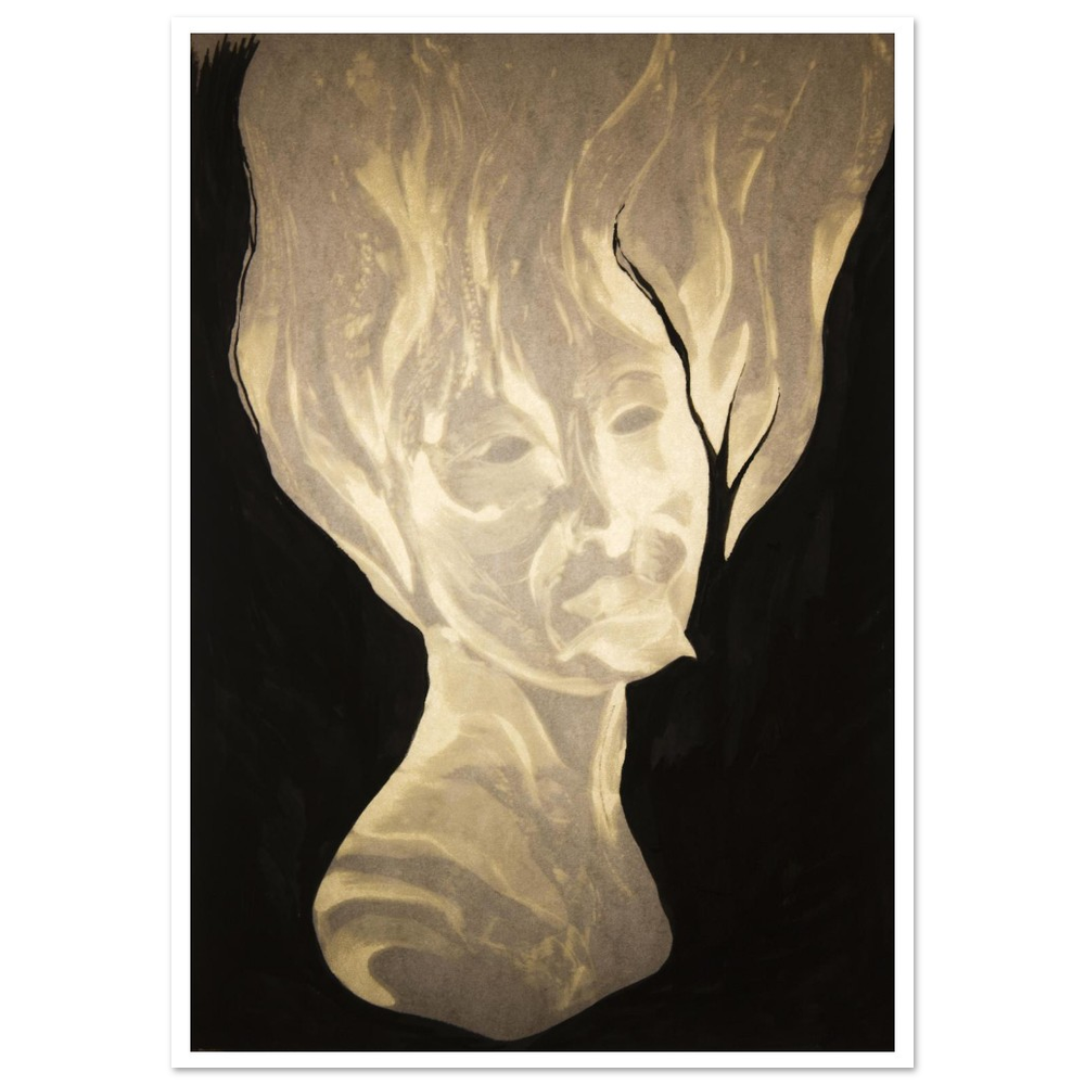 In the drawing a figure emerges from the darkness in a state of quiet transcendence. The face, softly illuminated from within, carries weightless calm.