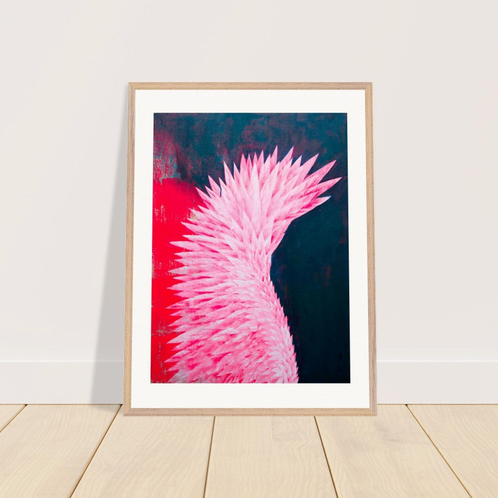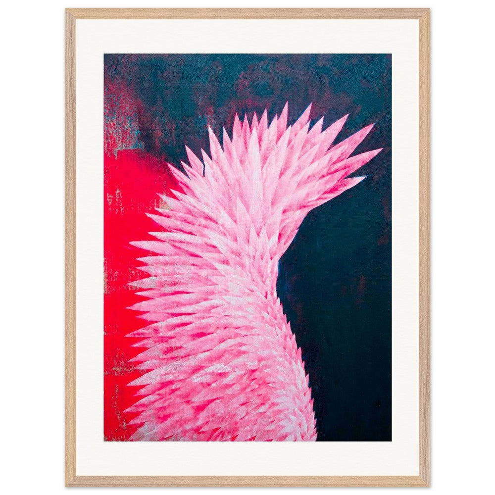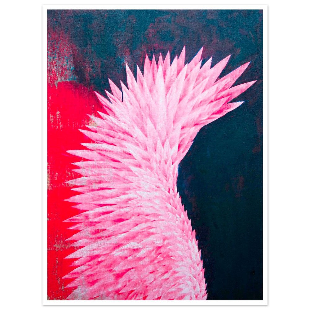 The original is an 81x60cm oil painting of a fleshy wing, painted on a canvas primed with a red chalk primer. The wing shape floats against a dark background, giving it a sense of weightlessness and tension at the same time.